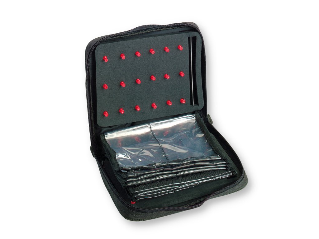 Z každé strany pouzdra je deska z tvrdé pěny, na kterou lze umístit hotové návazce.