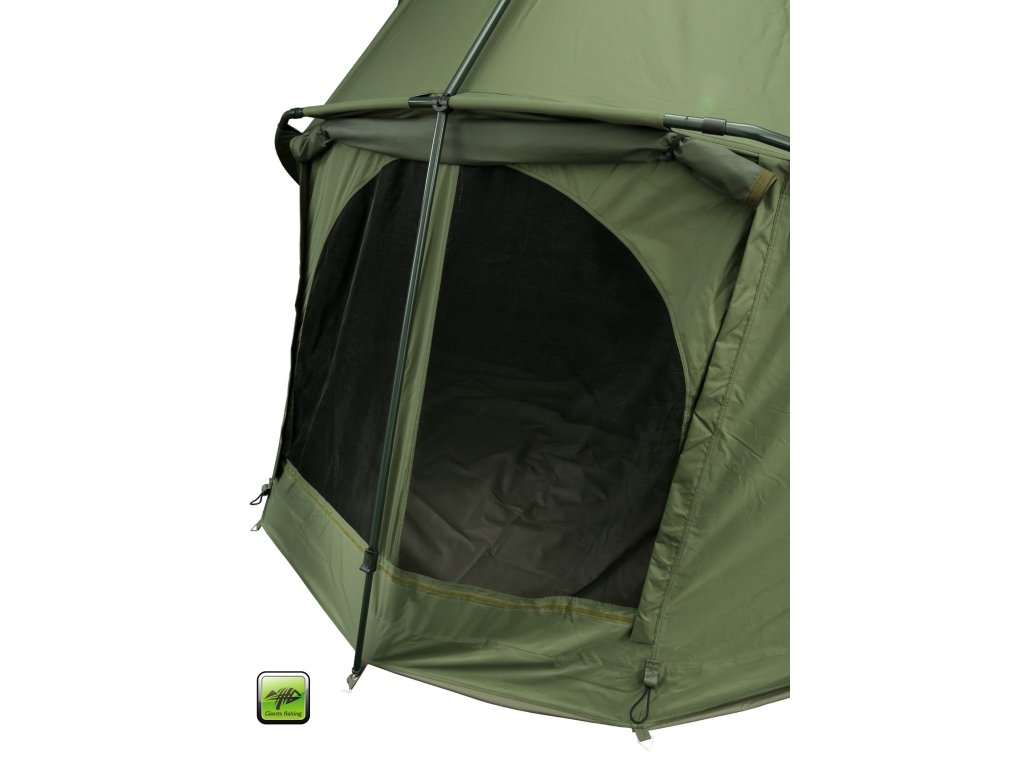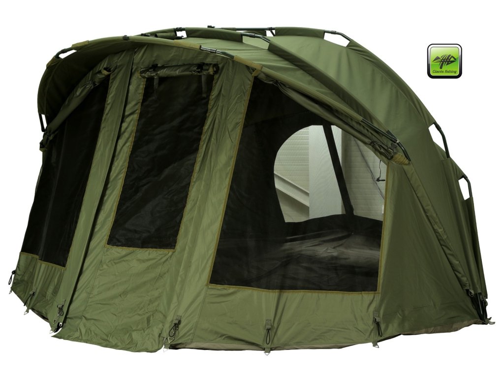 Luxusní a velmi prostorný bivak trubkové konstrukce, na který byl použit extrémně kvalitní materiál 10 000mm HH. Na tento bivak byl použit vodě odolný materiál 10 000mm HH (Hydrostatic Head), té nejvyšší kvality, který je 100% nepromokavý. Páskou podlepené švy a ukotvení na zavrtávací kolíky, které jsou v ceně přístřešku. Bivak je vybaven větracím systémem jak v přední části, tak v zadní jsou dva velké otvory, kter é zajistí maximální odvětrání. Velký přední kšilt nad vchodem, je navíc osazen dvěma praktickými úchyty na pruty. Konstrukce bivaku je vyrobena z aluminiové slitiny a pro maximální stabilitu, jsou přidány čtyři polohovatelné rozpěrné tyče. Přední vchodová část má, tři výměnné panely na suchý zip, celo zakrytá, nebo slídová a moskytiéra. Tento přístřešek je dodáván se zesílenou pogumovanou odnímatelnou podlážkou, která se k bivaku připojí kvalitním zipem. Propojení podlážky se zipem je cca 10cm nad zemí, díky tomuto provedení vám do bivaku nenateče voda a nedostanou se tam hlodavci či hmyz. Díky svým obřím rozměrům, je bivak určen pro dva až tři rybáře. Při našem testování se do bivaku snadno vešla tři osminohá lehátka. Rozměry: Délka: 320cm Šířka: 310cm Výška: 170cm Hmotnost: 16kg Transportní rozměr: 135x25x25cm