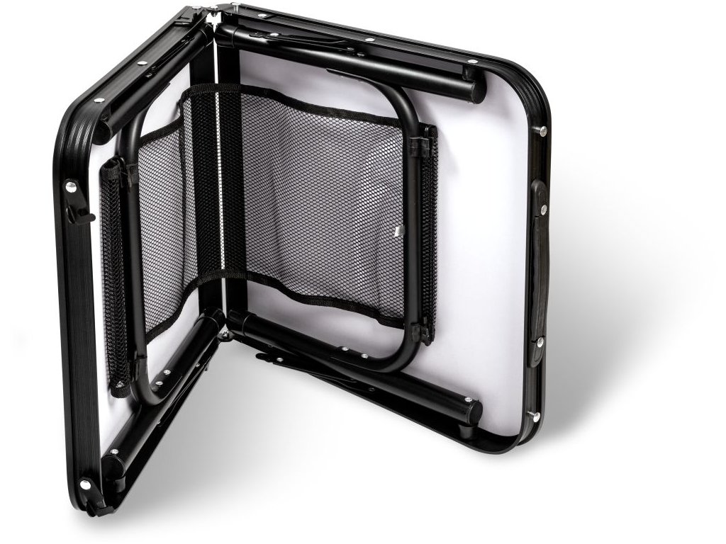 BEZPEČNÁ ODKLÁDACÍ PLOCHA: svrchní deska stolu má zvrásněný povrch a postará se tak o bezpečnou odkládací plochu pro drobný rybářský materiál, pod deskou se nacházející síťka slouží jako druhá, skrytá odkládací plocha.