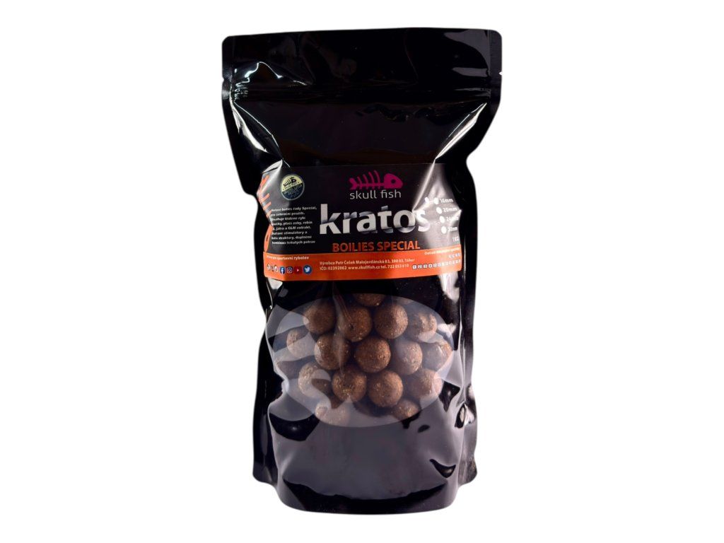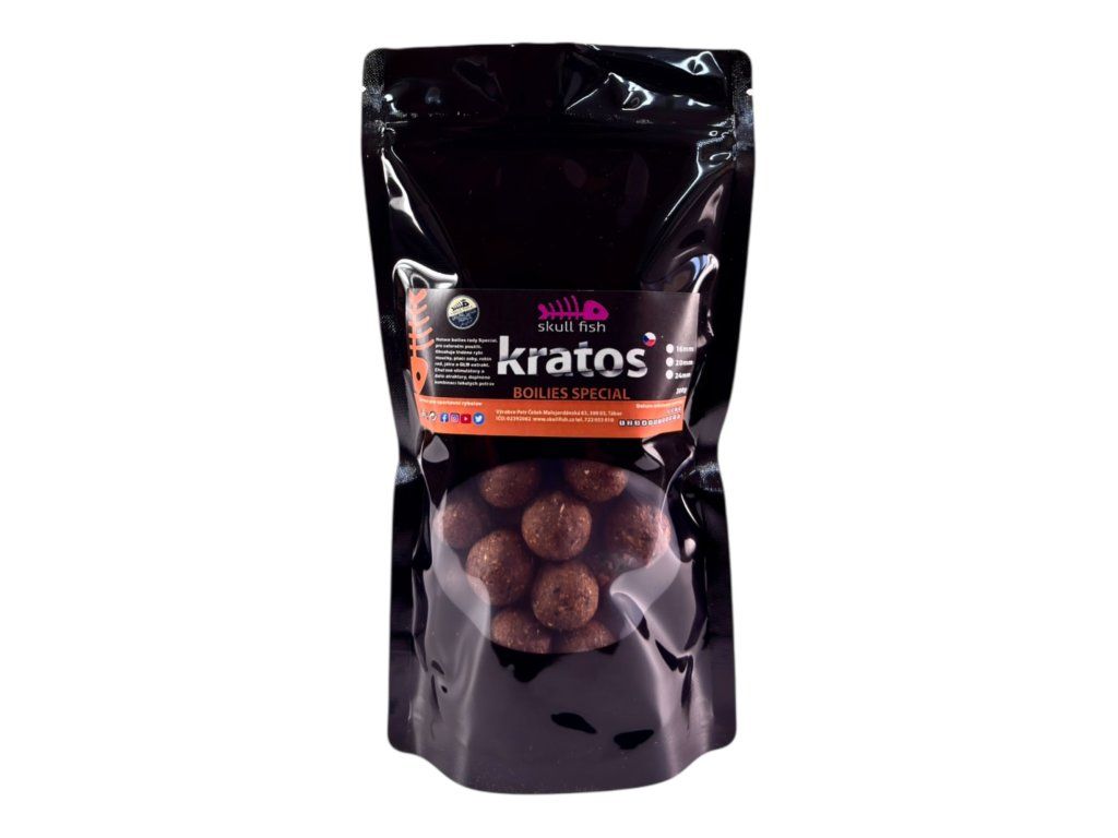 Boilies Kratos je masová nástraha postavená na kombinaci chobotnice a mořských korýšů, která vytváří extrémně silný signál ve vodě. Boilies Kratos obsahuje živočišné moučky, rozpustné proteiny a atraktory jako GLM extrakt, díky čemuž kapři reagují rychle a vrací se zpět.