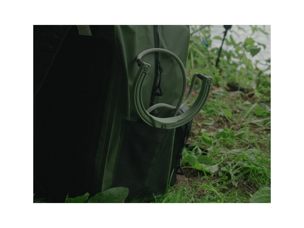 Pohodlí a komfort při transportu umocňují nastavitelné ramenní popruhy spolu s měkčenou výztuhou zad. Pro snadný úchop je na vrchní straně pogumované držadlo a po bocích jsou dvě plastová oka, za která si můžete připnout karabinu například s podběrákem.