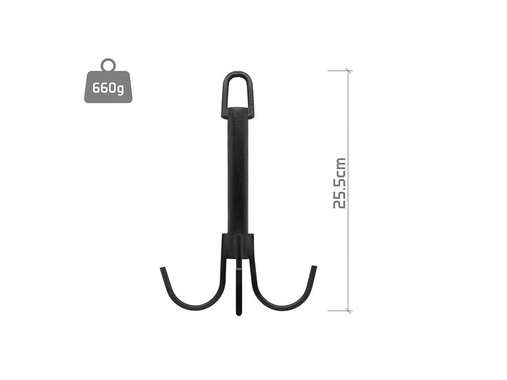 Na spodní části těla je kotva vybavena čtyřmi zachytávacími háky dostatečně velkého rozměru, aby usnadnily vylovování vlasce či šňůry. Ve vrchní části se nachází velké oko určené k upevnění lana, které si můžete přizpůsobit dle typu revíru a hloubky vody. Všechny prvky jsou k tělu pevně přichyceny kvalitními sváry.