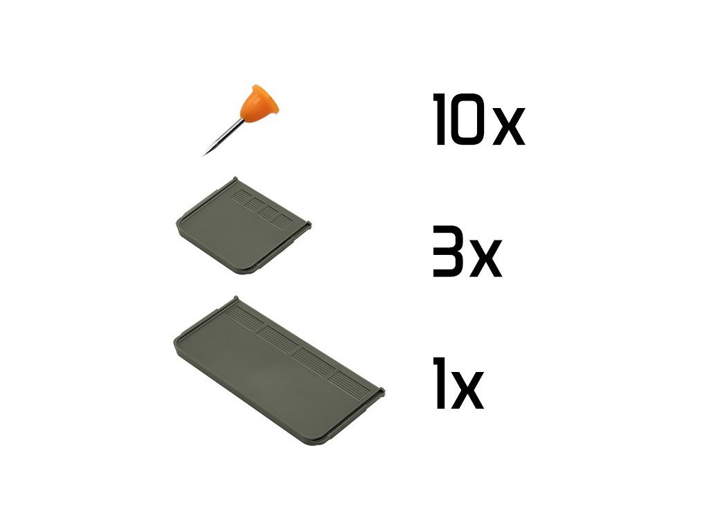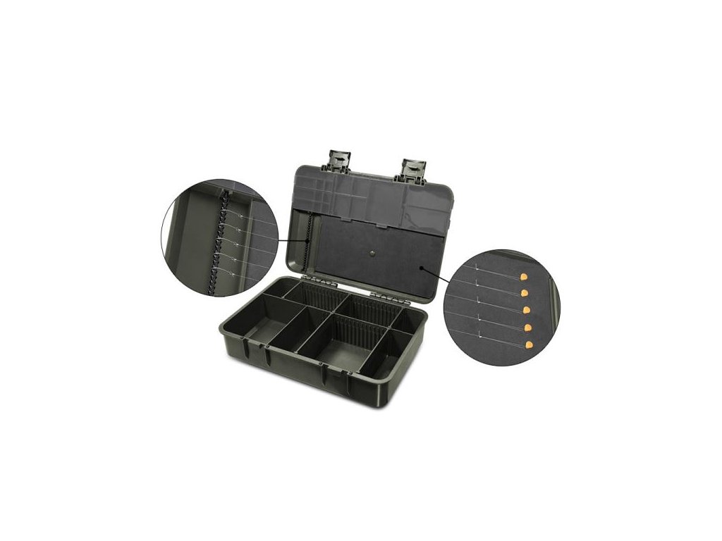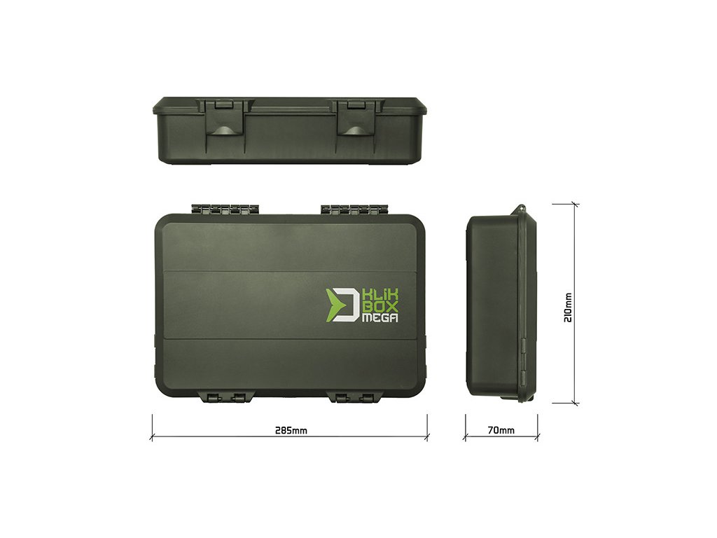 Ve spodní části boxu se nacházejí přihrádky, disponující vyjímatelnými přepážkami, čímž lze tento prostor přizpůsobit vašim požadavkům. Na vrchní straně je několik průhledných, uzavíratelných přihrádek různých rozměrů, které poskytují ideální prostor pro uložení drobné bižuterie. Díky jejich průhlednému provedení, budete mít vždy přehled o tom co se uvnitř nachází a potřebnou komponentu tak najdete během mrknutí oka. Kromě toho se na vrchní straně nachází také plato z tvrzené pěny a špendlíky, což umožňuje uchycení koncových montáží. KlikBOX Mega vám tak umožní sbalit vše potřebné k lovu, abyste byli vždy dokonale připraveni. K uzavření organizéru poslouží masivní klipy, které se postarají o to, aby vše zůstalo na svém místě.