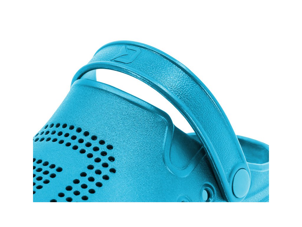 Dalším sofistikovaným prvkem jsou velké postranní otvory, jejichž prioritním úkolem je starat se o odvětrávání a celkovou vzdušnost v této obuvi. Záměrně nejsou navrženy ve výši podrážky, jak to bývá standardem, ale o něco výše. Právě tento detail hraje významnou roli během pobytu na břehu, či mělké vodě. Tím, že otvory jsou o něco vyšší nad vnitřní stélkou je téměř eliminováno nechtěné nabírání písku či kamínků mezi podrážku a chodilo. Vaše chodidla jsou tedy chráněny v maximální možné míře. Kromě těchto otvorů slouží k odvětrávání hustá perforace umístěna ve vrchní části. Ta je záměrně vytvarována na jedné straně do symbolu D z loga Delphin, na druhé vsuvce zase kraluje symbol O, jako počáteční písmeno názvu OCTO. Celkový dojem ještě zhodnocuje jemná struktura na povrchu pantoflí, která evokuje kůži chobotnice. Díky použitému EVA materiálu jsou mimořádně lehké, houževnaté a dokonce plovoucí. Samozřejmostí je u tohoto modelu poutko na fixaci paty (lidově nazývané i uzávěrka), které oceníte zejména v nerovné, či svahovitejšom terénu.