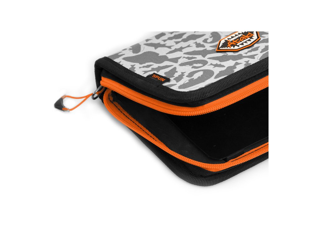 Doplňky oranžové barvy umožňují rybáři, aby byl penál dobře viditelný i za šera a uměl ho okamžitě najít. Design tašky doplňuje naše jedinečná šedá ATAK! kamufláž se siluetami dravých ryb.