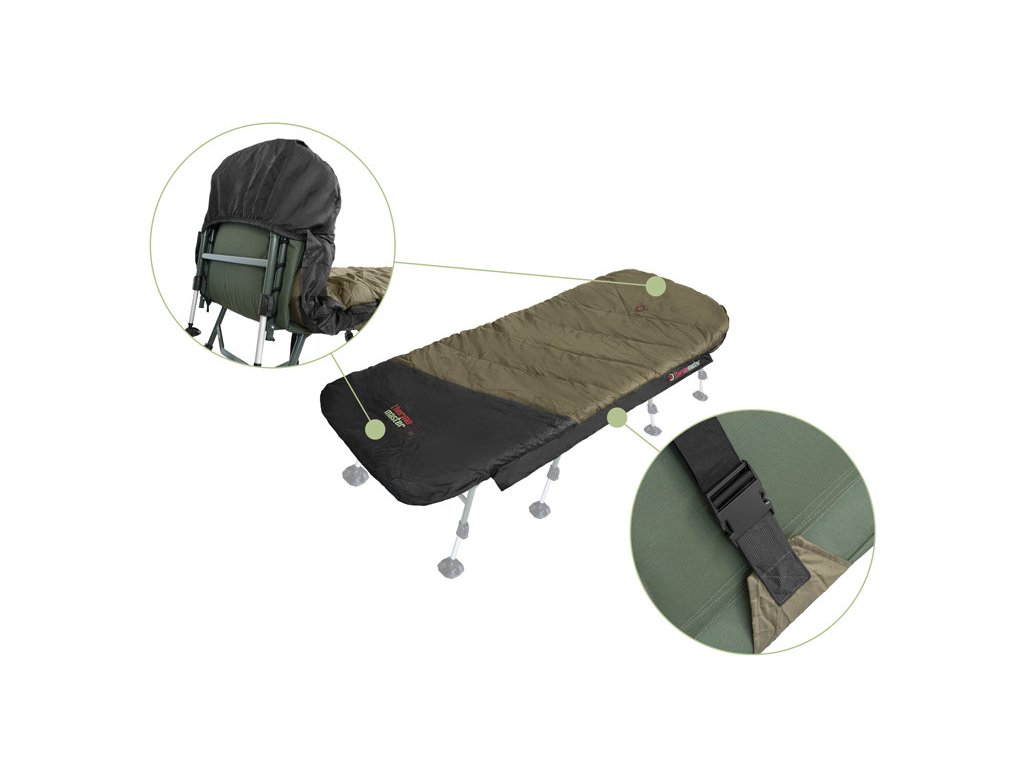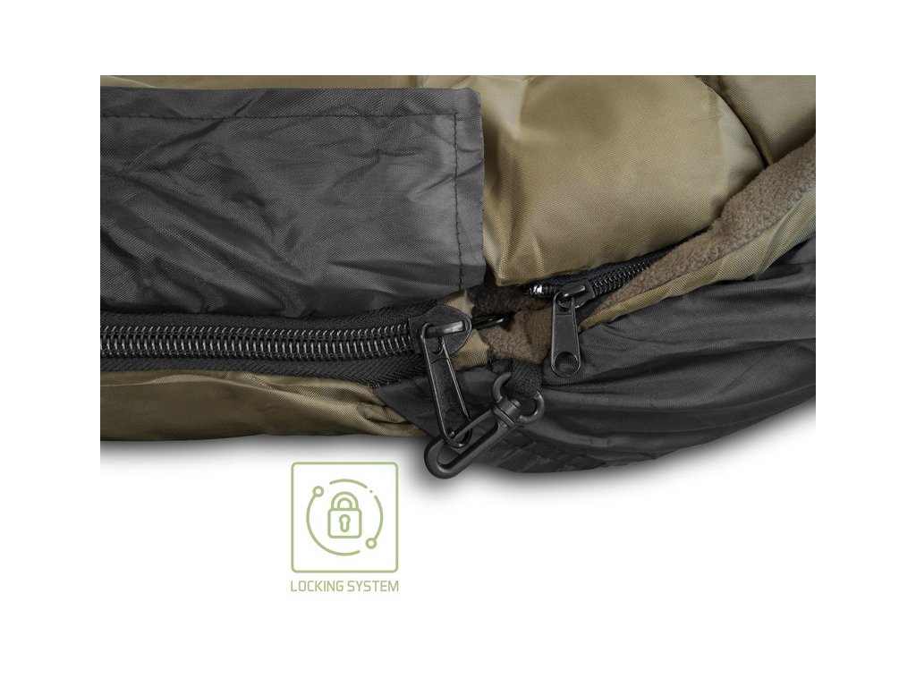 Všechny vnitřní vrstvy jsou tvořeny měkkým fleecem hnědé barvy, který je příjemný na dotek a také výjimečně hřejivý, takže se budete cítit komfortně i v extrémní zimě. Hlavní zip po obou stranách je mohutný, pevný a nezasekává se, čili pokud budete mít záběr, stačí potáhnout vrchní vrstvu a můžete utíkat za rybou. Zip na druhé straně si můžete zafixovat pomocí plastové pojistky ve tvaru spony. Mezi každou vrstvou se nacházejí další jemnější zipy umožňující využití kterékoli z vrstev dle vnějších podmínek a Vaší osobní preference. Všechny zipy jsou překryty lemem nepromokavé látky, a tím pádem chráněny před deštěm. V hlavové části se nachází kapsa vhodná pro umístění a uzavření jakéhokoli menšího polštáře.