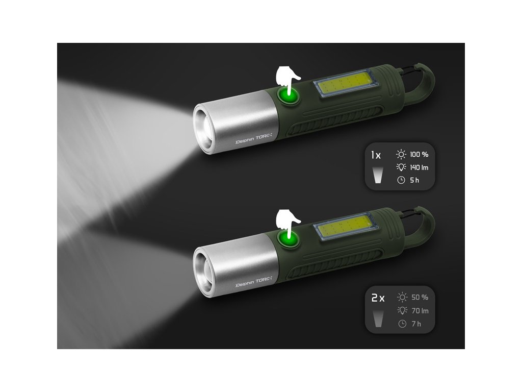 Prvním stisknutím se aktivuje hlavní dioda s funkcí ZOOM a 100% intenzitou svícení (140 lumenů), přičemž výdrž baterie v tomto režimu je přibližně 5 hodin. Druhý stisk sníží intenzitu světla na 50 % (70 lumenů). Třetím kliknutím se zapne druhá dioda s bílým světlem a plnou intenzitou 170 lumenů, ve které svítilna vydrží fungovat přibližně 5 hodin. Čtvrtým stisknutím se aktivuje zelené světlo, ideální například jako poziční osvětlení – jeho výdrž dosahuje až 24 hodin.