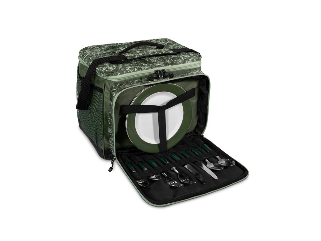V přední části je velká kapsa, ve které je umístěna kompletní jídelní sada pro dvě osoby. Obsahuje dva kusy plastových talířů, dva nože, dvě vidličky, dvě lžíce a dvě malé dezertní lžičky. Odteď si můžete dopřát více komfortu, i když jste u vody se svou polovičkou nebo parťákem!