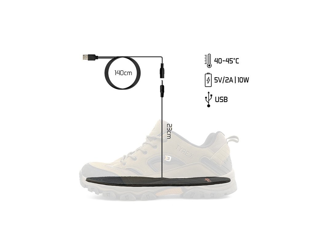 Univerzální velikost 40-46 umožní použít při široké škále velikosti obuvi. Vložky po připojení pomocí USB koncovky do power banky, nebo jiného zdroje elektrické energie (nedoporučujeme připojení vložek přímo do elektrické sítě), dokáží vyhřát vnitřek vaší boty do teploty 40-45°C. To oceníte zejména během zimních dní, ať už při chůzi nebo při delším setrvání na jednom místě během lovu. K maximálnímu komfortu přispívá i příjemný měkký materiál, ze kterého jsou vyrobeny. Po odpojení od zdroje teplota vložek pomalu klesne.