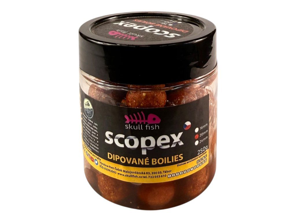 Dipované boilies Scopex je hotová nástraha určená pro okamžité záběry. Díky napuštění v tekutém dipu obsahuje vysoké množství atraktorů, olejů a sladidel, které se ve vodě rychle uvolňují a vytváří silný pachový signál.