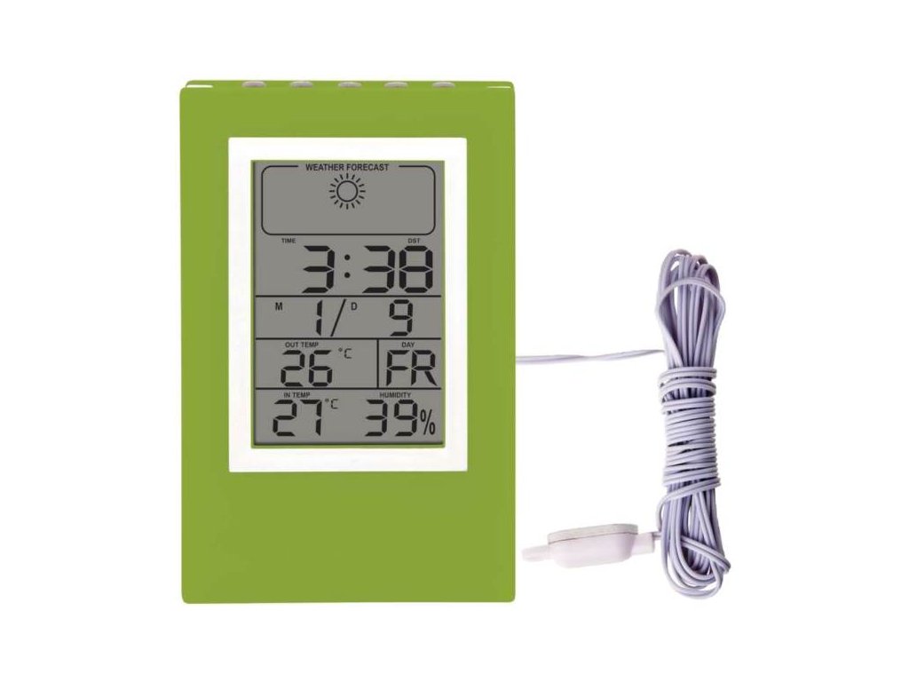 Domáca meteostanica Meteostanica v peknom modernom dizajne ktorá zobrazuje hodiny, budík s funkciou opakovaného budenia, predpoveď počasia, údaje o vnútornej a vonkajšej teplote, vlhkosti. Špecifikácie: Hodiny riadené Quartz kryštálom Ukazovateľ vnútornej: -9 °C až +70 °C Ukazovateľ vonkajšej teploty:-50 °C až +90 °C Rozlíšenie teploty: 1 °C Presnosť: ±1 °C Drôtová vonkajšia sonda: 1,7 m Ukazovateľ relatívnej vlhkosti: 20 % – 95 % s presnosťou ±5 % Zdroj: 2 x 1,5V LR1130 batérie sú súčasťou meteostanice