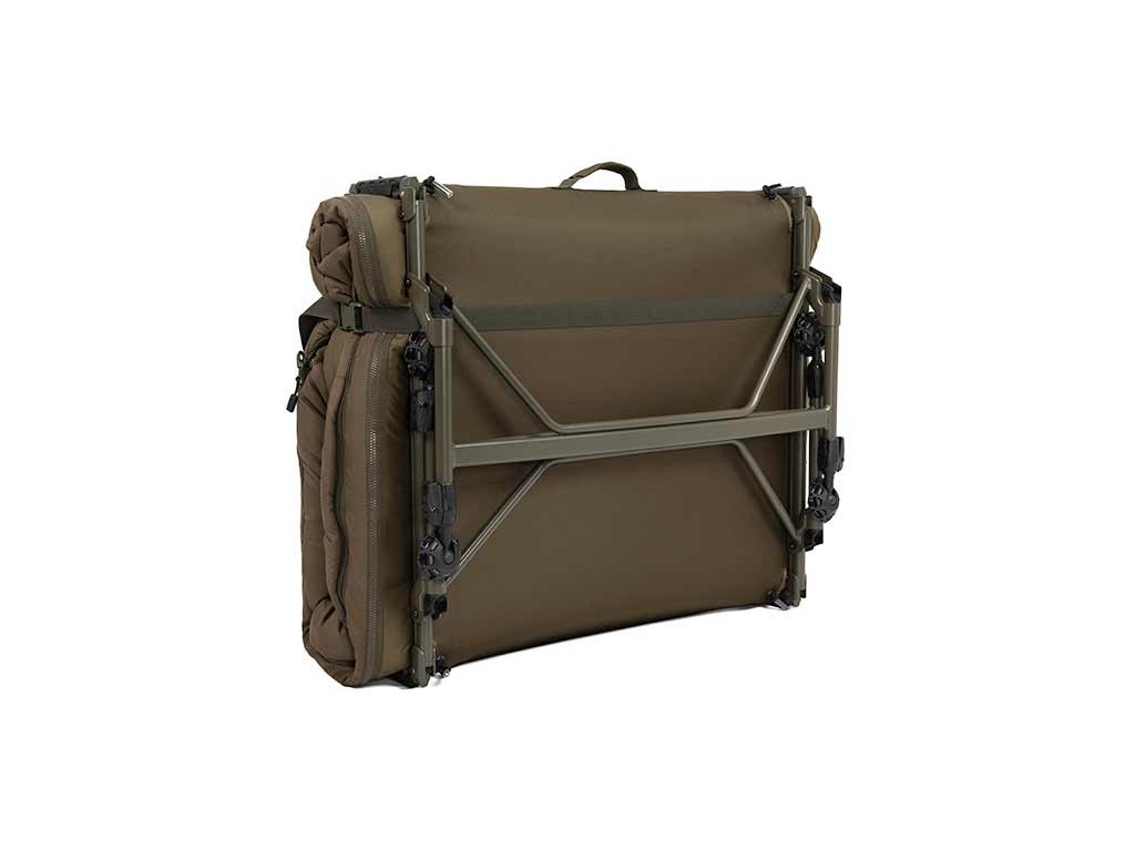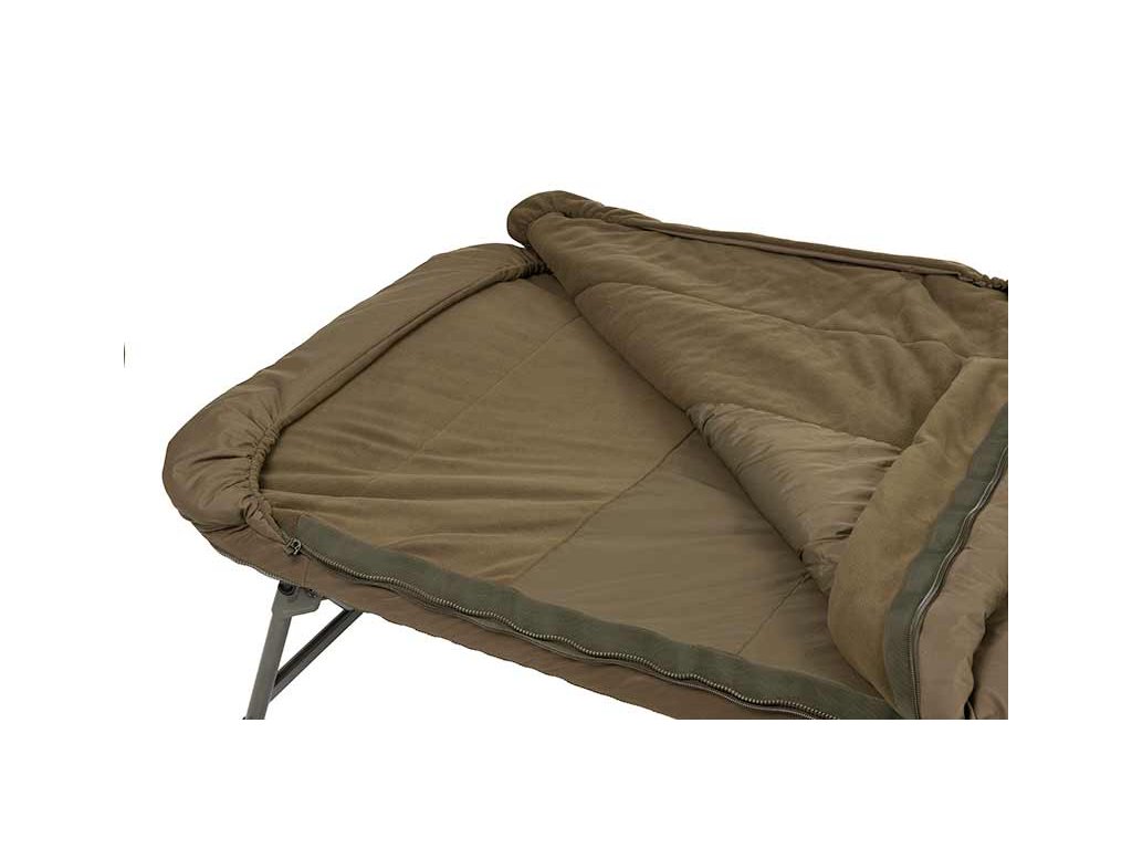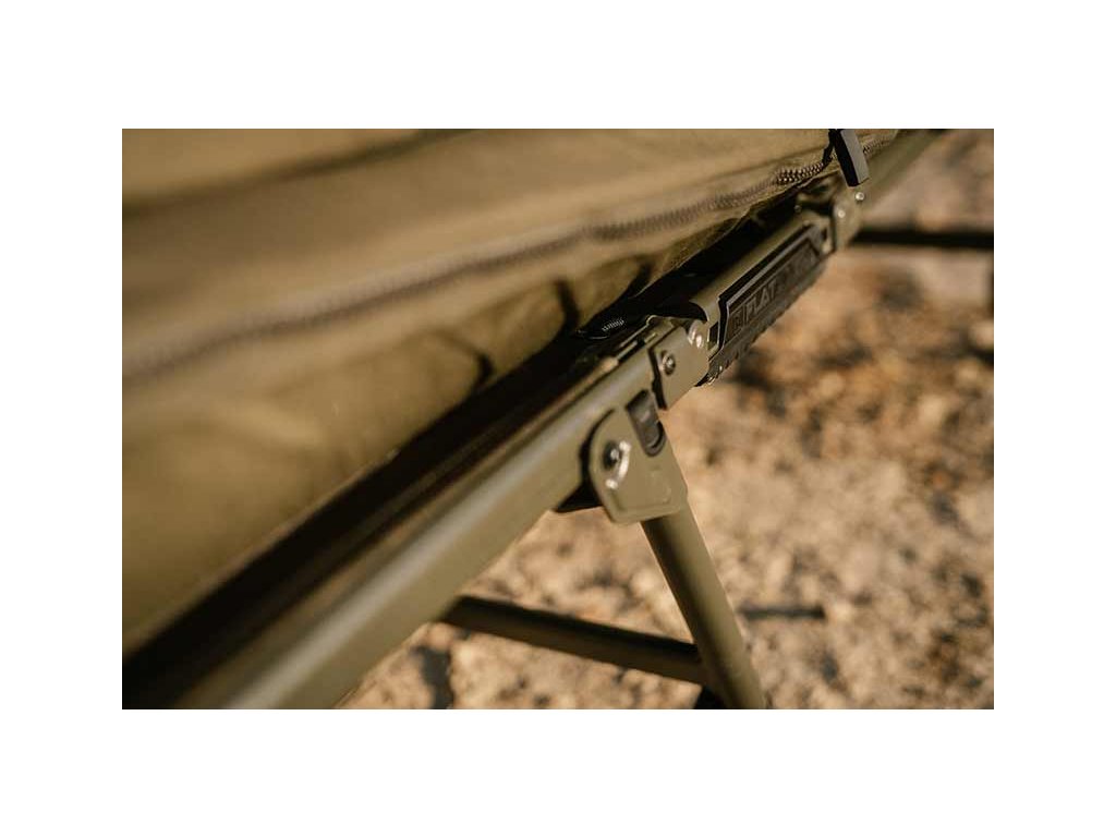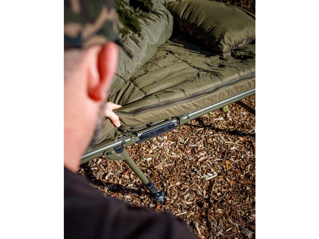 Použití je maximálně jednoduché. Spací pytel je k lehátku připevněn zipem, takže při rozložení drží pevně na místě a při přetočení se nijak nepřekrucuje. Díky velkým pantům můžeš lehátko složit i s nasazeným spacákem, což zrychlí přesun mezi místy. Výškově nastavitelné nohy s jednobodovým mechanismem umožňují rychlé doladění roviny i na nerovném terénu.