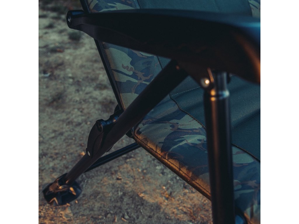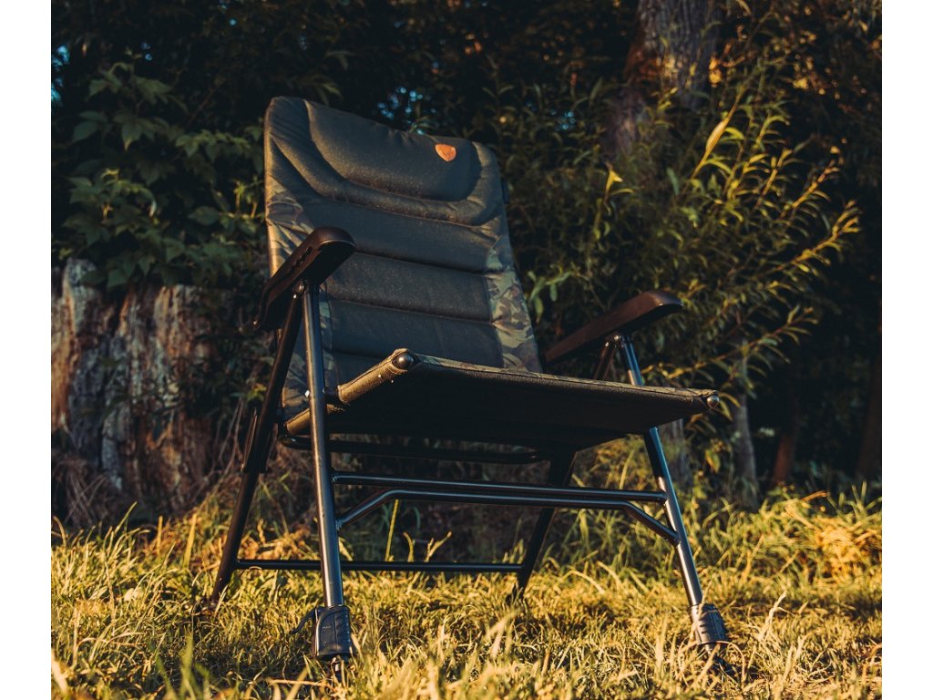 Jednoduchá, ale velmi stabilní a pevná konstrukce. Polohování opěrného systému je docíleno pomocí područek, které je jednoduché a trvanlivé. Polstrování v novém camo designu. Velkou a příjemnou výhodou je vysoká zádová opěrka, která činí 74 cm, tedy ideální i pro vyšší postavy. Sedačka je komfortní i co se týče šířkou, která číní 54 cm. Tedy pro silnější postavy zde je dostatek místa.