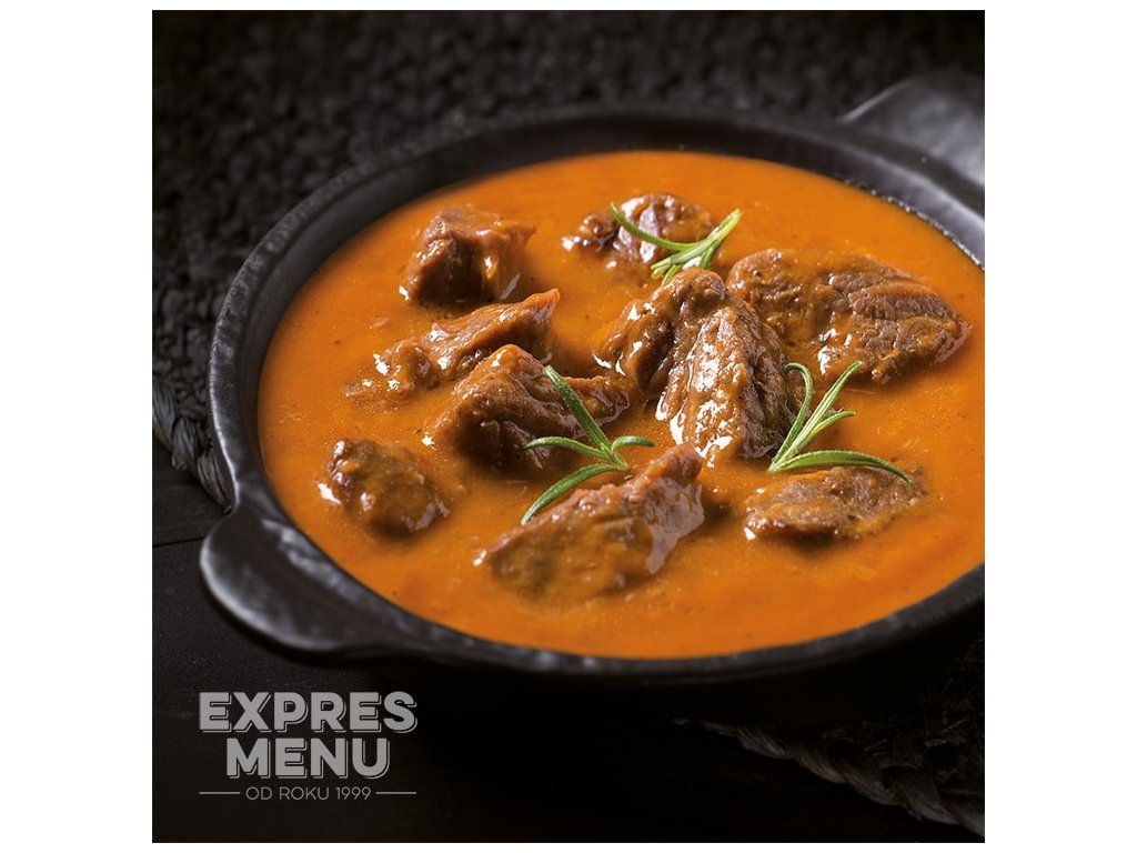 hovězí maso přední (31 %), hovězí vývar (voda, hovězí maso a kosti), cibule, rýžová mouka, česnek, kukuřičná mouka, řepkový olej, rajčatový protlak (voda, rajčatový protlak, sůl), paprika mletá, sůl kamenná, majoránka, kmín, pepř.