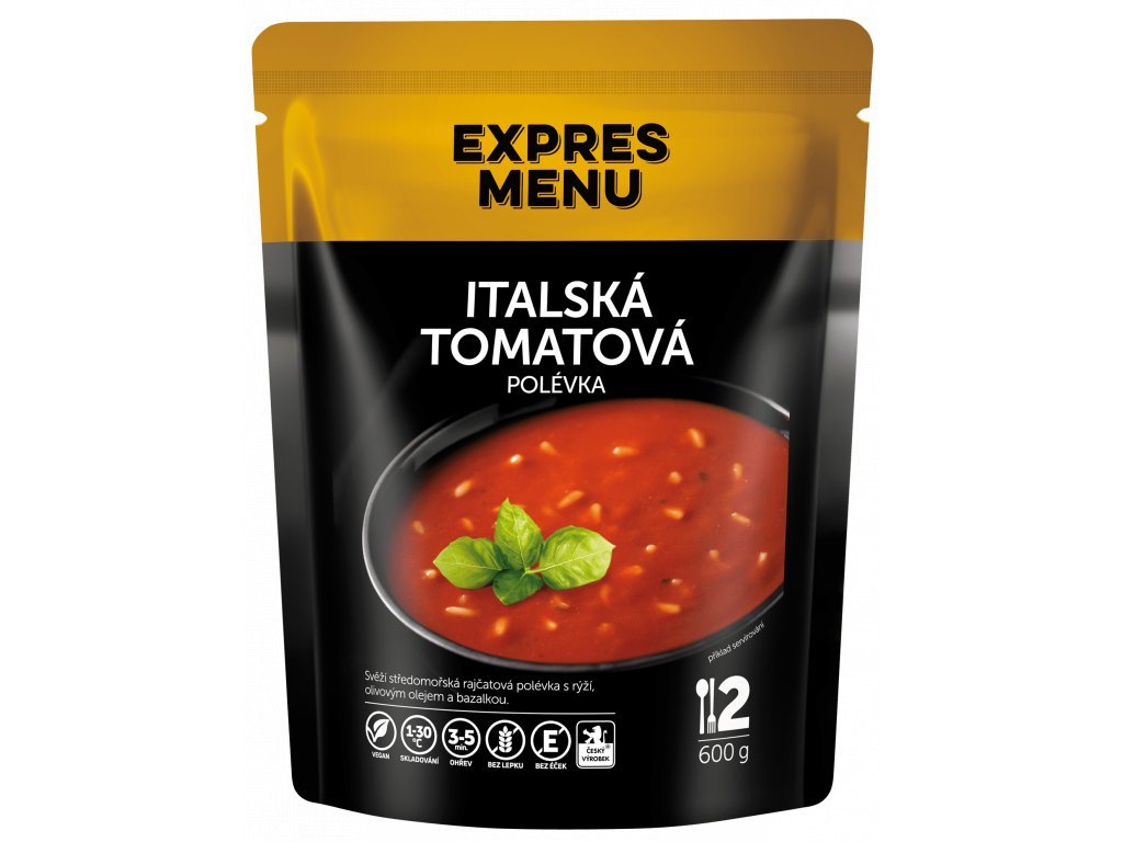 voda, rajčata krájená (rajčata (60 %), rajčatová šťáva, jedlá sůl, regulátor kyselosti: kyselina citronová), rajčatový protlak (9 %) (voda, rajčatový protlak, sůl), rýže (11 %), olivový olej, cibule, rýžová mouka, kukuřičná mouka, cukr, sůl kamenná, bazalka, libeček, pepř.