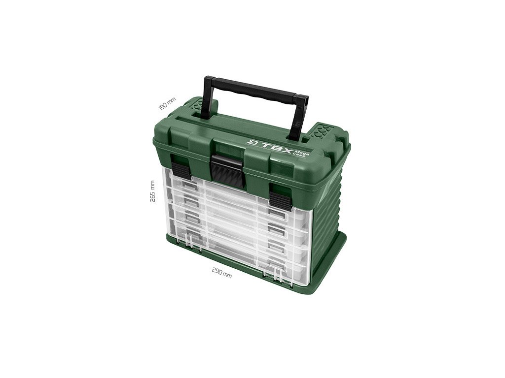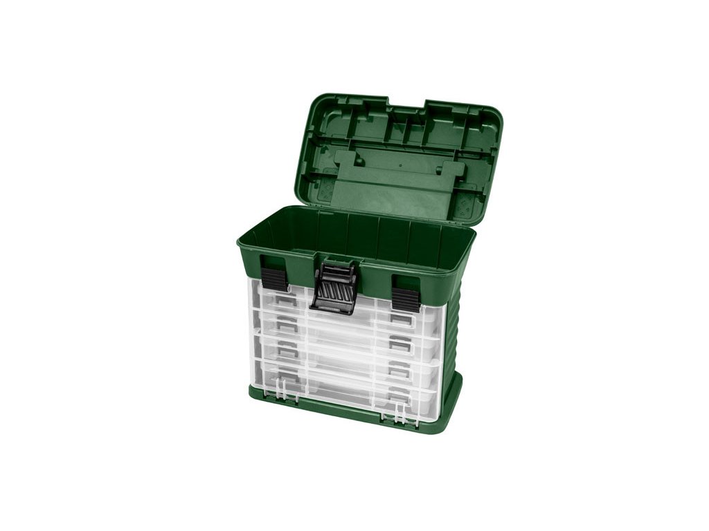 V přední části se nachází výklopný díl z průhledného materiálu. Jím se dostanete ke 4 stejně velkým plastovým krabičkám, které jsou součástí kufříku. Krabičky obsahují plastové příčky, aby si každý rybář mohl přihrádky v krabičkách přizpůsobit podle vlastních představ. Je dodáván v kombinaci barev tmavozelená s transparentním poklopem.