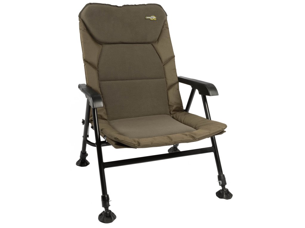 Klasické křeslo s nastavitelnými nohami a pohodlným, tuhým opěradlem.