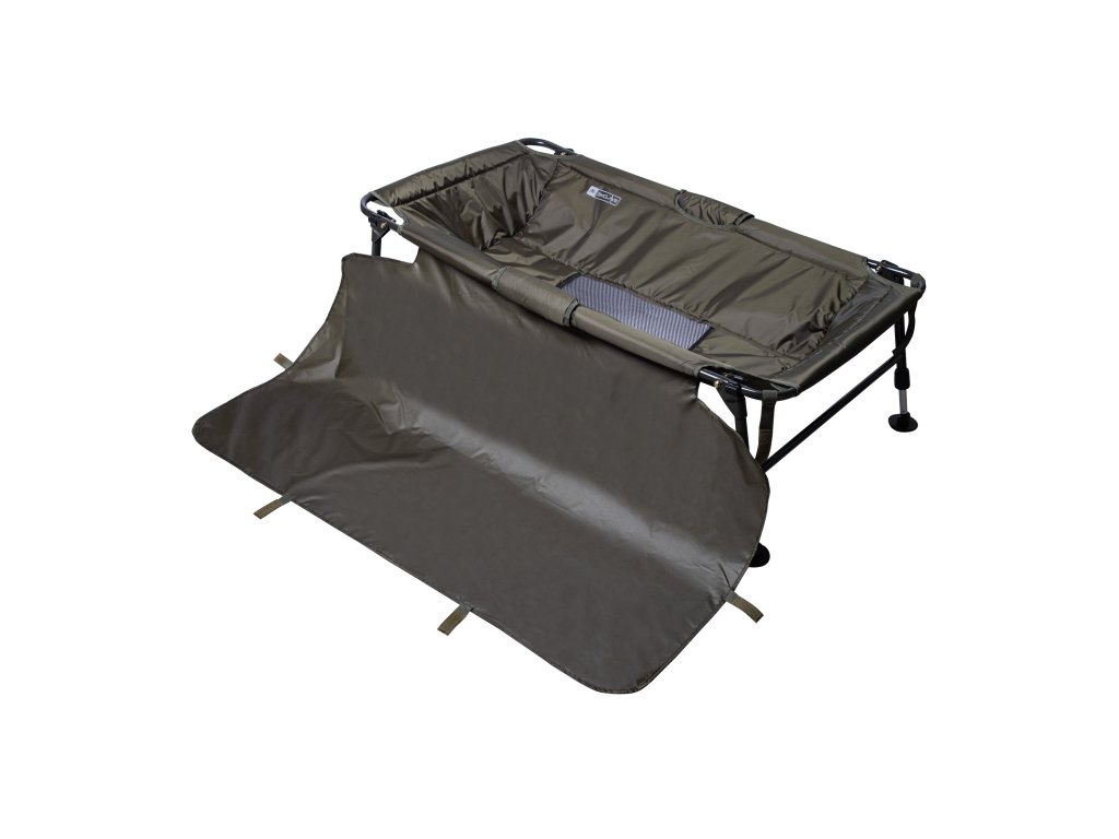 Mimořádně pečlivě vyrobená kaprová podložka s 4 nastavitelnými nohami, odtokem vody, víkem a přepravním vakem.