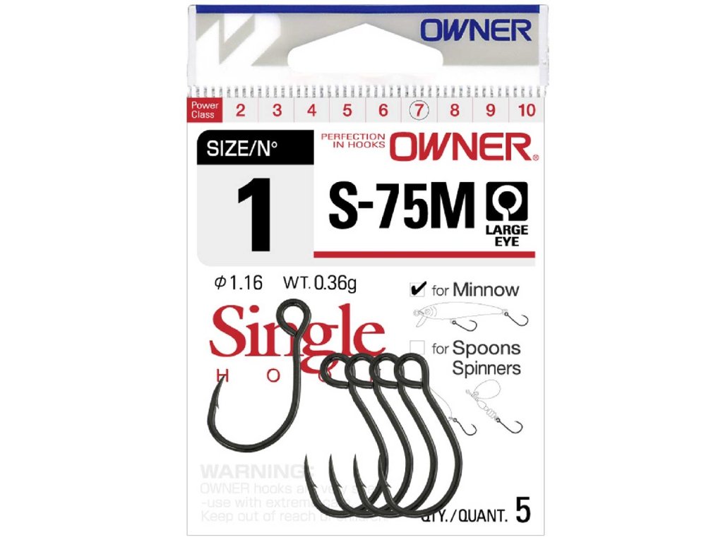 Háček OWNER S-75 - Ideální jednoháček pro nahrazení trojháčků na sladkovodní a pobřežní vláčení nebo trolling. Je zejména vhodný do oblastí se spoustou trávy nebo vázek, které činí lov s trojháčky prakticky nemožný. Tyto jednoháčky také minimálně poškodí ulovené ryby, při aplikaci metody "chyť a pusť". balení-8 ks velikost-6
