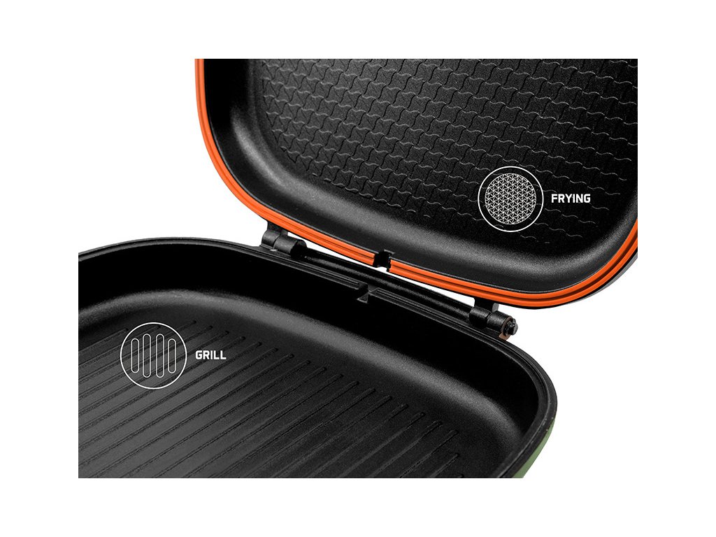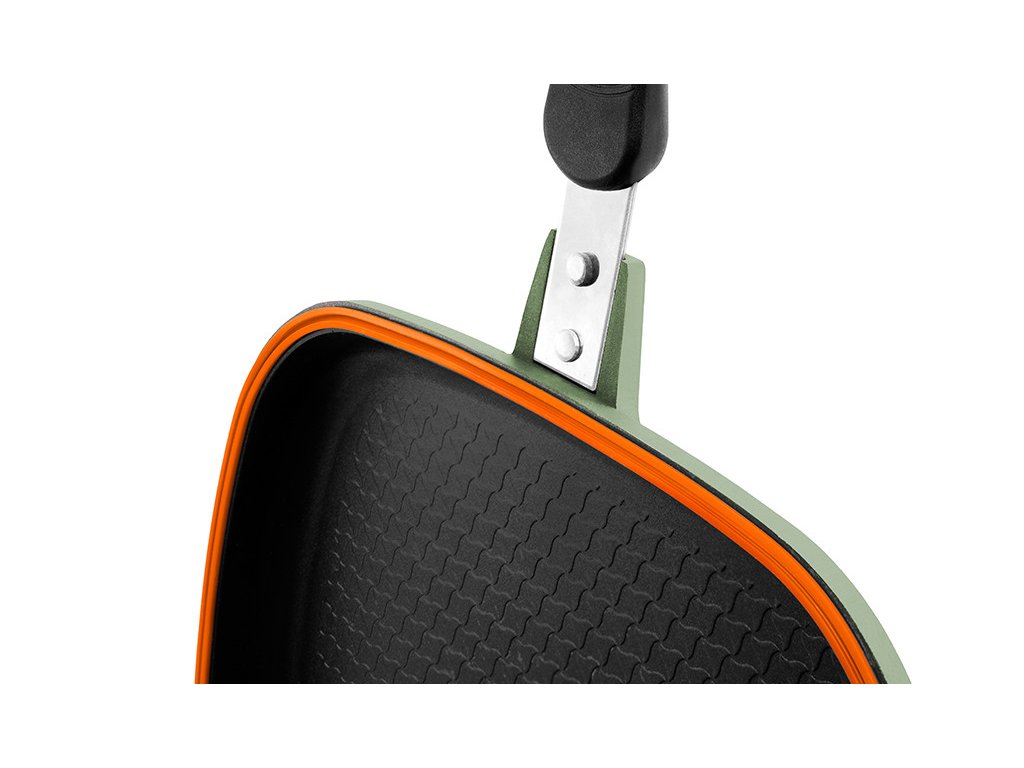 Díky magnetu na rukojeti jednotlivé poloviny po uzavření výborně drží spolu a pánev tak můžete během přípravy pokrmu libovolně obracet. O dokonalou těsnost se přitom stará obvodové těsnění odolné vysokým teplotám. Jednoznačně největší výhodu uzavřené pánve je fakt, že teplo se uvnitř mnohem rychleji akumuluje a během vaření neuniká z pánve ven. Díky tomu je příprava jídla v přírodě mnohem rychlejší a jednodušší.