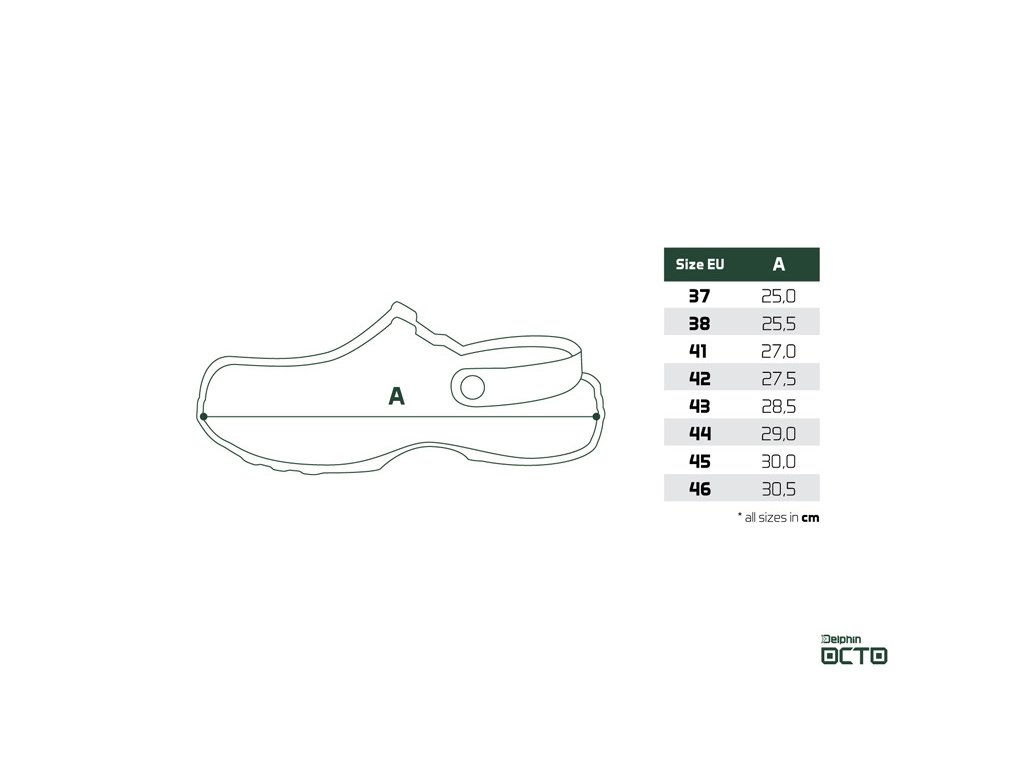 Od počátku vývoje tohoto produktu bylo naším záměrem přinést designově jedinečné vsuvky, které budou splňovat požadavky rybářů na maximální funkčnost a komfort během nošení nejen na rybách, ale i v běžném životě. A výsledek? Delphin OCTO - ultra lehké pantofle z EVA pěny, inspirované přírodou, kompletně navrženy a vyráběny v Evropské unii! Vzhledem k tomu, že během rybolovu je nutné často chodit po nerovném terénu, jsme se při vývoji zaměřili na podešev, která je podstatně pevnější a masivnější ve srovnání s levnějšími konkurenčními modely. Právě to zaručuje, že chození v těchto vsuvkách bude maximálně komfortní a dokonale odfiltruje nerovnosti terénu. Při podešvi ještě chvíli zůstaneme. Právě tam začíná příběh názvu OCTO. Stylizovali jsme ji totiž do tvaru přísavek chapadel chobotnice, což zaručuje výborný grip za každých podmínek. Právě chobotnice, anglicky OCTOpus, anebo latinsky OCTOpod byly inspirací pro kompletní design a název ve zkrácené forme - OCTO. Dalším sofistikovaným prvkem jsou velké postranní otvory, jejichž prioritním úkolem je starat se o odvětrávání a celkovou vzdušnost v této obuvi. Záměrně nejsou navrženy ve výši podrážky, jak to bývá standardem, ale o něco výše. Právě tento detail hraje významnou roli během pobytu na břehu, či mělké vodě. Tím, že otvory jsou o něco vyšší nad vnitřní stélkou je téměř eliminováno nechtěné nabírání písku či kamínků mezi podrážku a chodilo. Vaše chodidla jsou tedy chráněny v maximální možné míře. Kromě těchto otvorů slouží k odvětrávání hustá perforace umístěna ve vrchní části. Ta je záměrně vytvarována na jedné straně do symbolu D z loga Delphin, na druhé vsuvce zase kraluje symbol O, jako počáteční písmeno názvu OCTO. Celkový dojem ještě zhodnocuje jemná struktura na povrchu pantoflí, která evokuje kůži chobotnice. Díky použitému EVA materiálu jsou mimořádně lehké, houževnaté a dokonce plovoucí. Samozřejmostí je u tohoto modelu poutko na fixaci paty (lidově nazývané i uzávěrka), které oceníte zejména v nerovné, či svahovitejšom terénu. Delphin OCTO jsou jednoduše stylovou letní obuví, jedinečného designu, s velmi širokým využitím. Ať už potřebujete přezůvky do interiéru, jít na ryby, vykoupat se, neboli do města. OCTO jsou tu aby vás převedli všemi nástrahami dne komfortně a s lehkostí. Jediným mínusem je, že nejsou vhodné pro vysokohorskou turistiku, to však díky ostatní všestrannosti určitě oželíte :) Jelikož jsou pantofle vyrobeny z EVA materiálu, vedle množství výhod třeba dbát i na péči o tento materiál. Nenechávejte ho proto vystaven dlouhodobě přímému prudkému slunečnímu záření na rozpálených kamenech či betonu. Právě tam může teplota atakovat až 50 stupňů Celsia, což může způsobit jemné tvarové deformace. Samozřejmě, pokud jsou pantofle na nohách, k takovému jevu nedochází a životnost se počítá na roky. velikosti: 41, 42, 43, 44, 45, 46