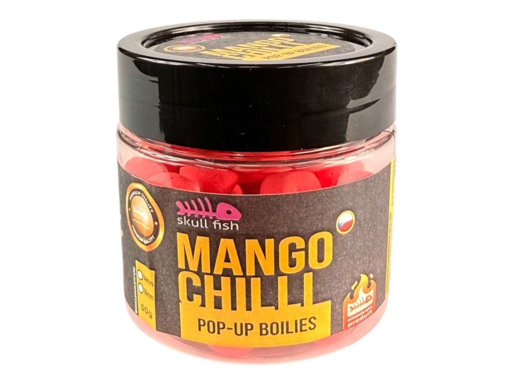 Pop-up boilies Mango Chilli od Skullfish je plovoucí nástraha navržená pro maximální viditelnost a okamžitou reakci ryb. Díky kvalitnímu mixu z kaseinátů a mléčných proteinů má vysokou vzlínavost a stabilní vztlak.