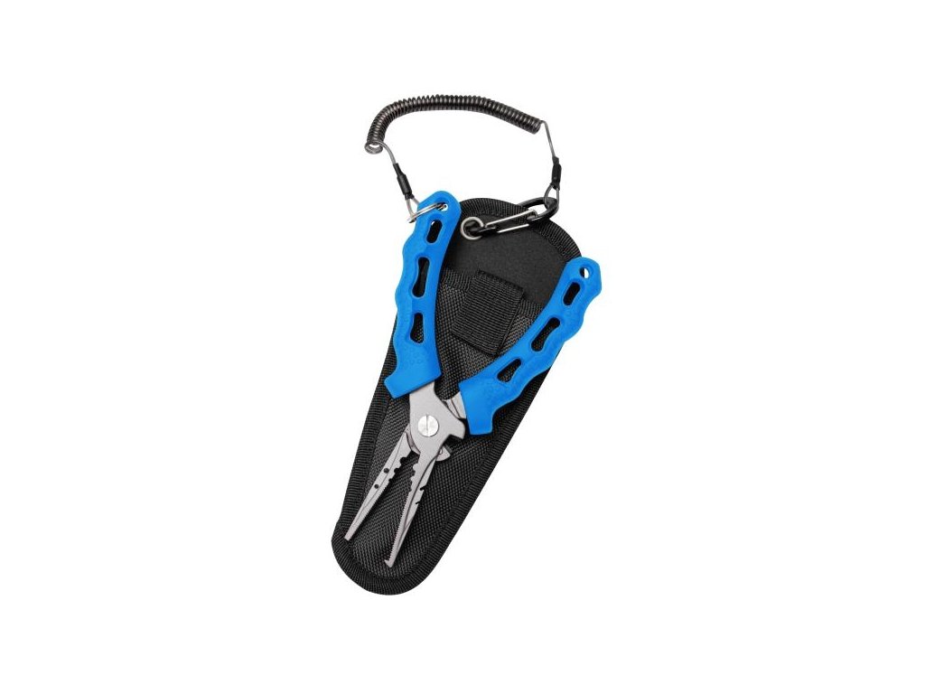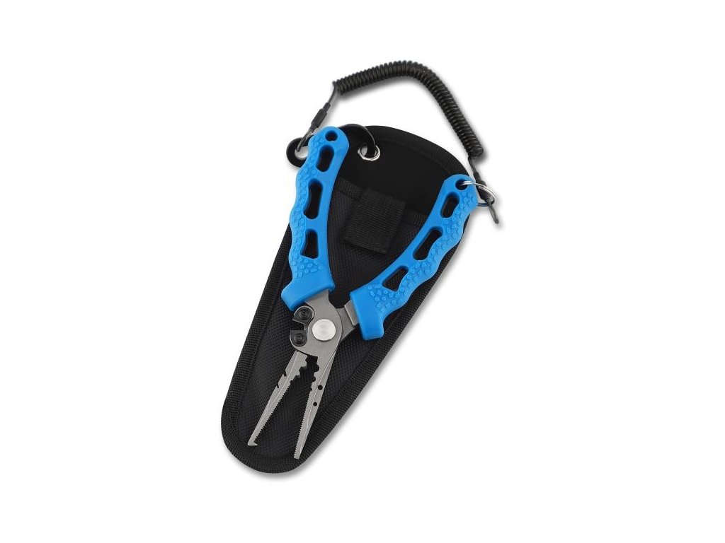Přenosné rybářské kleště, které lze připevnit přímo na opasek, oděv nebo rybářskou tašku.